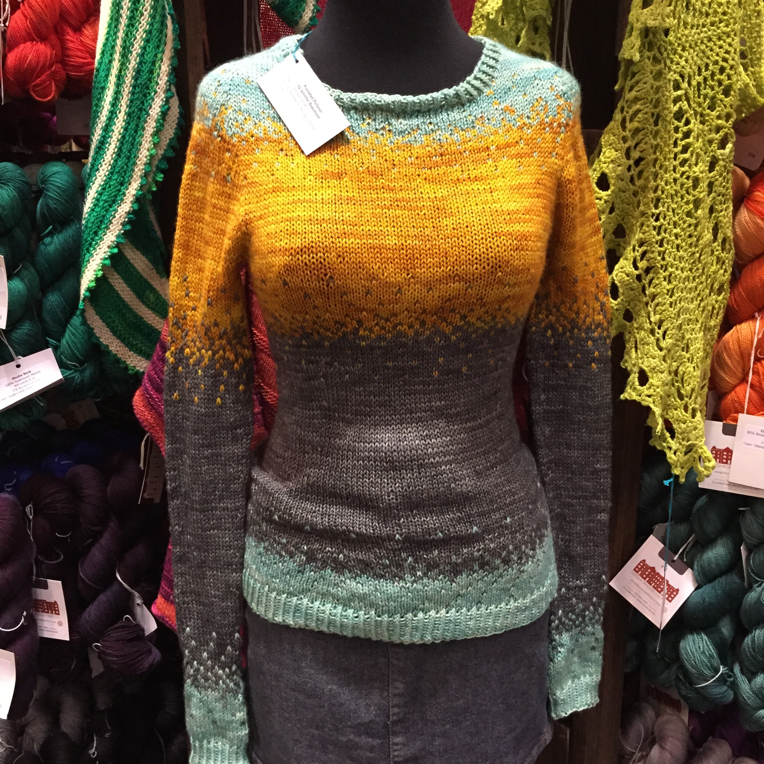 My girls also had a good time. My mom and sister took DD1 while I shopped. I think the escalator was her favorite part, though her chocolate milk snack was a close second. DD2 had a great time snuggled up against my chest. I swear I couldn’t go more than a few feet before being stopped by someone wanting to take a peek at my red headed girl, but I don’t blame them. Babies in hand knits are irresistible!