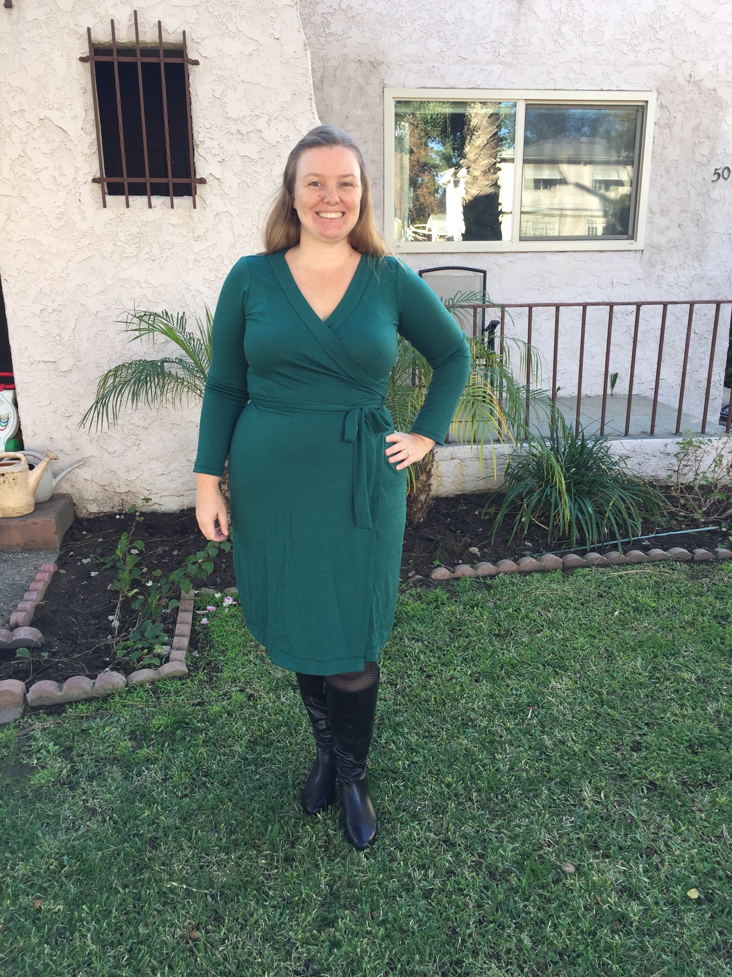 The pattern was not without it’s issues though. If you look really closely at the pattern art you’ll see the neckline was supposed to be a deep V. What I didn’t realize is the V would go really low, like you could see a significant portion of my bra. I’d cut the front on the fold instead of putting in a front seam so I could avoid pattern matching down the front. I’d even raised the neckline a tad to account for the lost seam, but apparently it wasn’t enough!